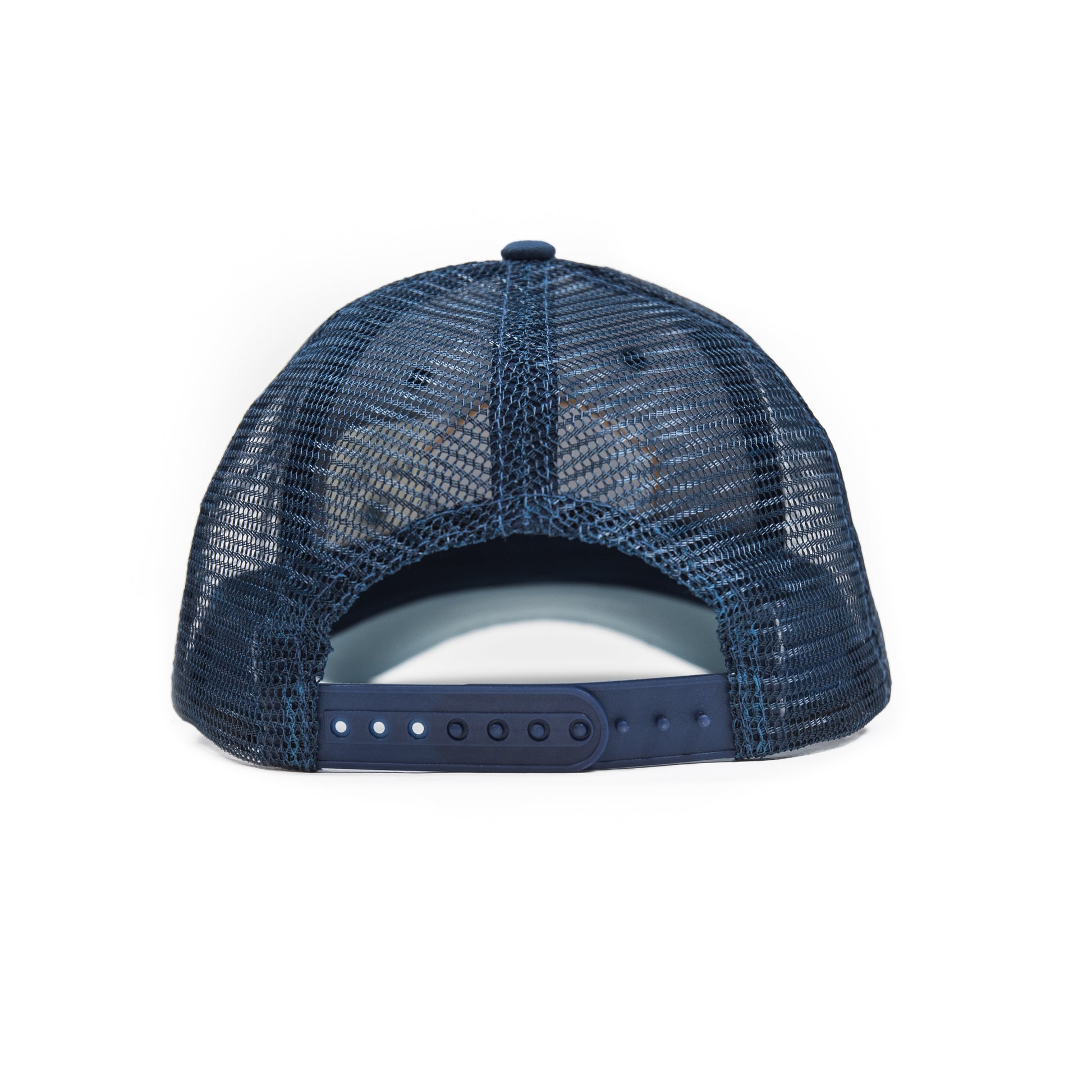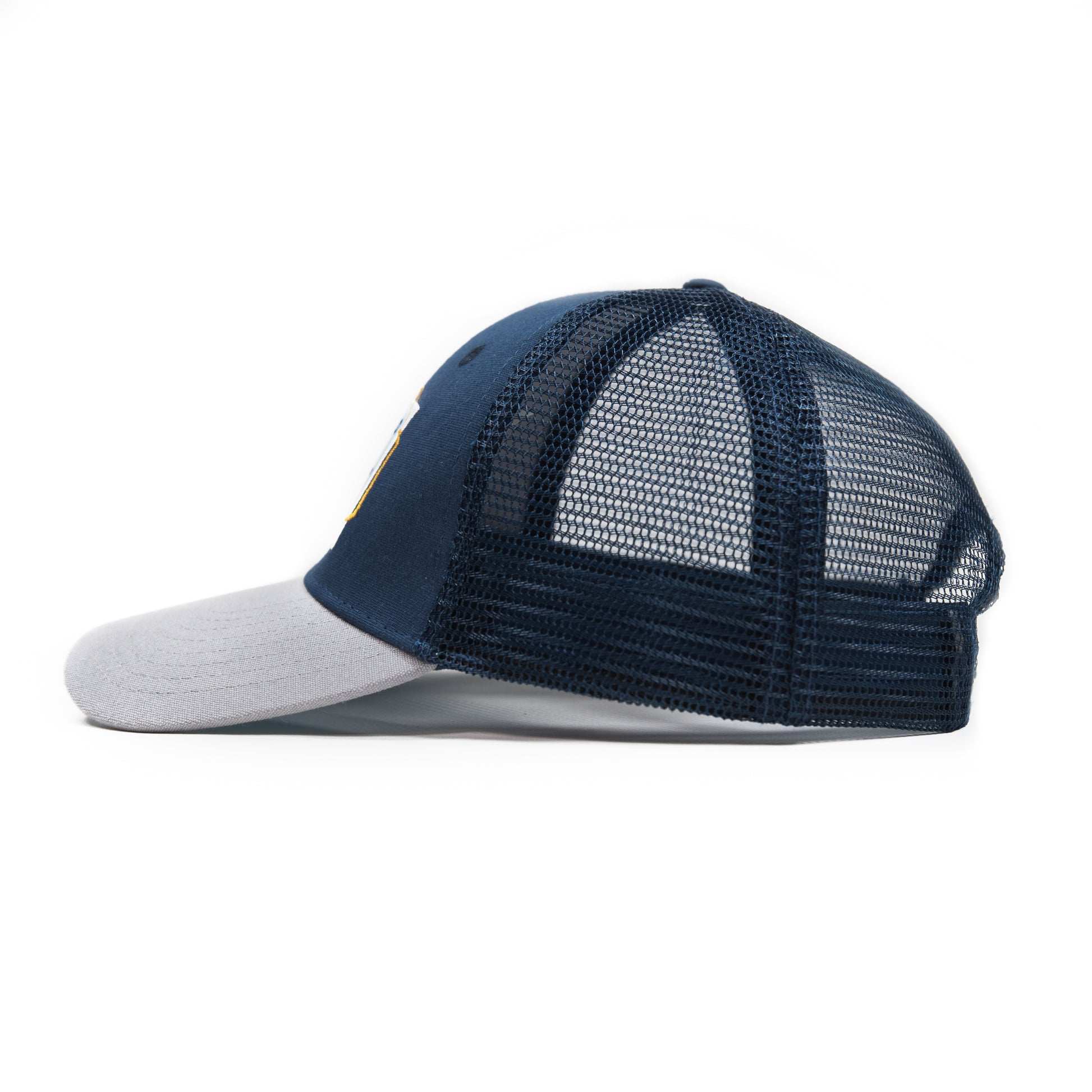 Fit: Classic, Mid Pro Mesh Back Trucker with a slightly curved brim Color: Navy Blue Crown, Mesh Backing & Button Top, Brown Bill & Band, Light Blue Bill Underside