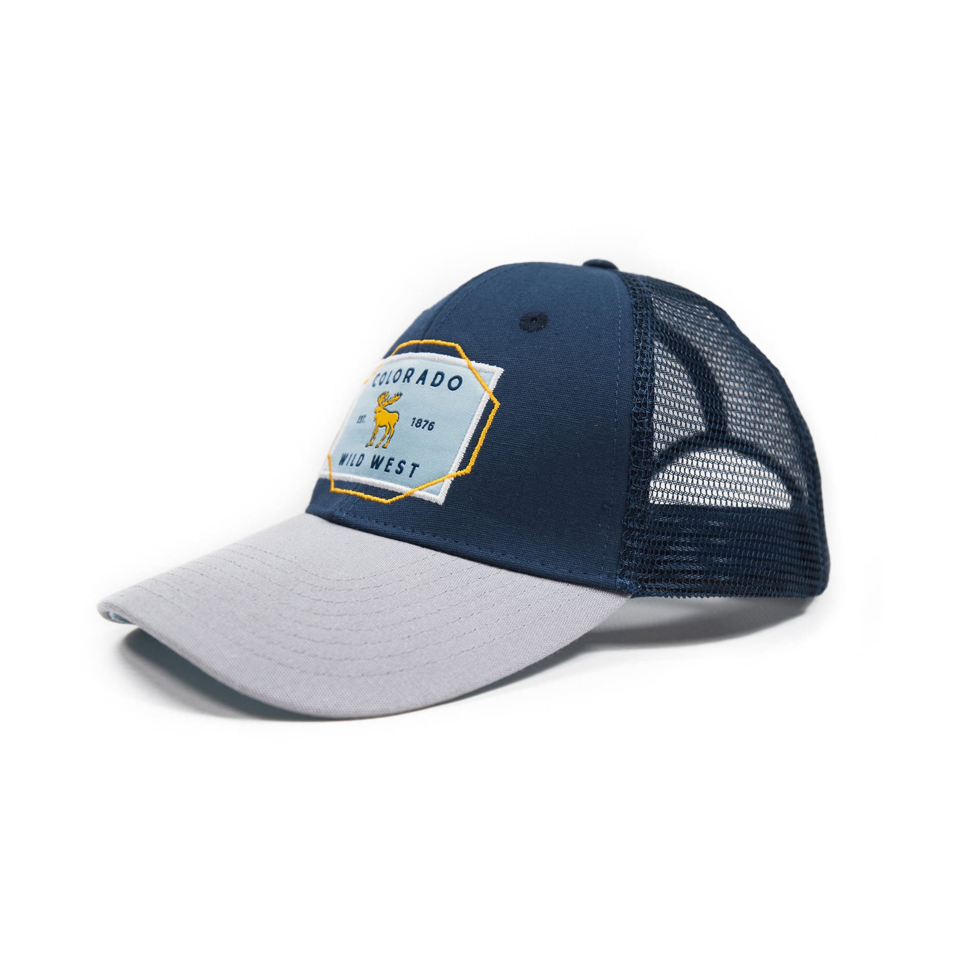 Front: 3-Inch Woven Patch – Light Blue Background with Mustard Yellow Moose, Navy Blue Font, White Embroidered Edge & Mustard Yellow Embroidery overlap Back: Brown Snapback Closure