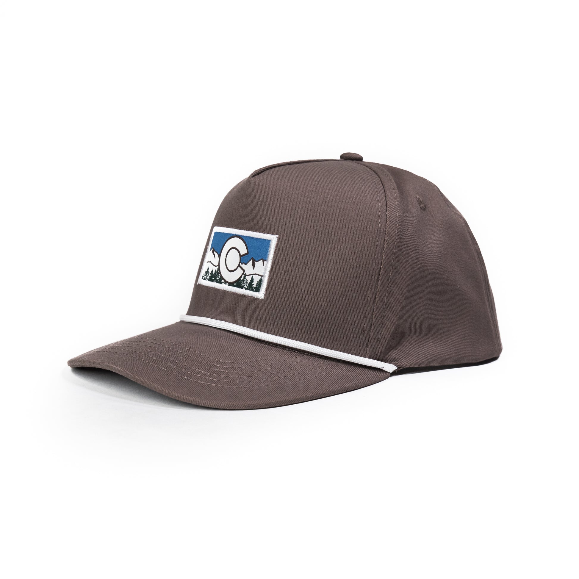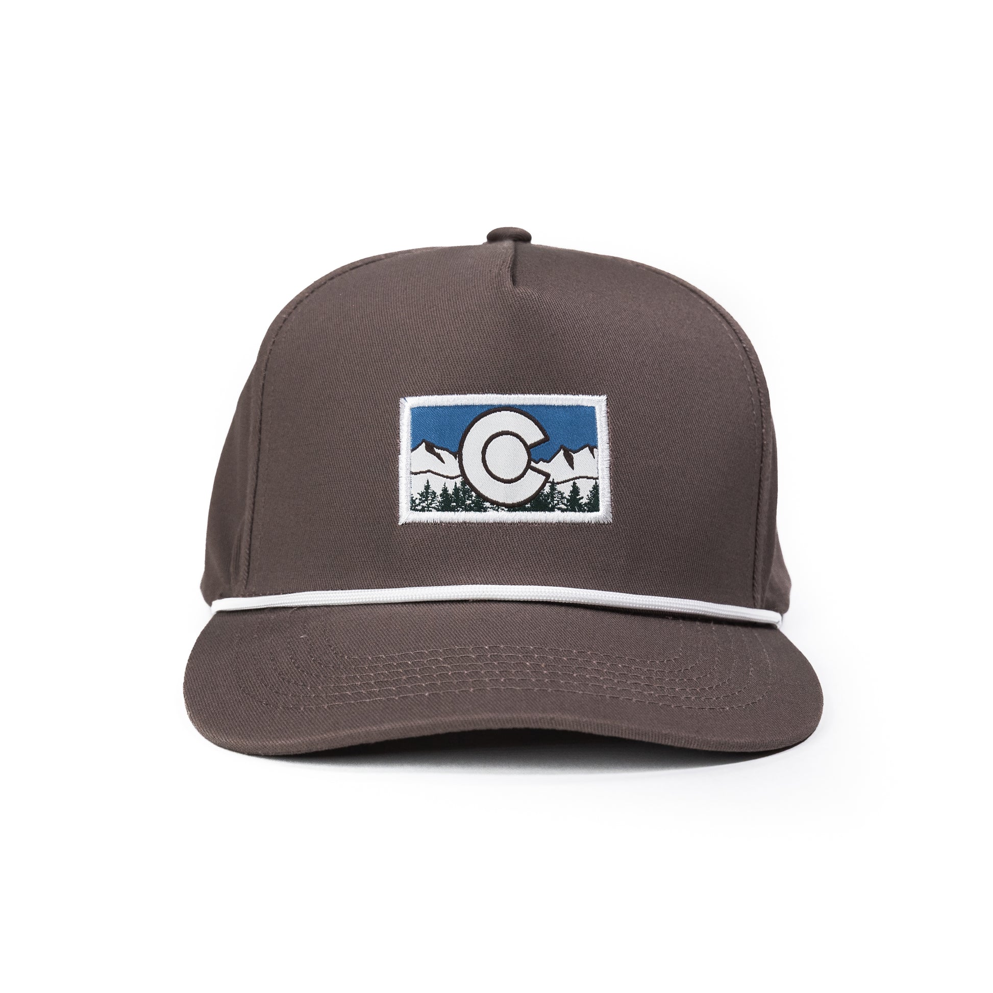 Front: 2.25-Inch Woven Patch – Off White Colorado Logo & Mountains, Dark Forest Trees, Light Blue Sky, Grey Rope Back: Taupe Snapback Closure